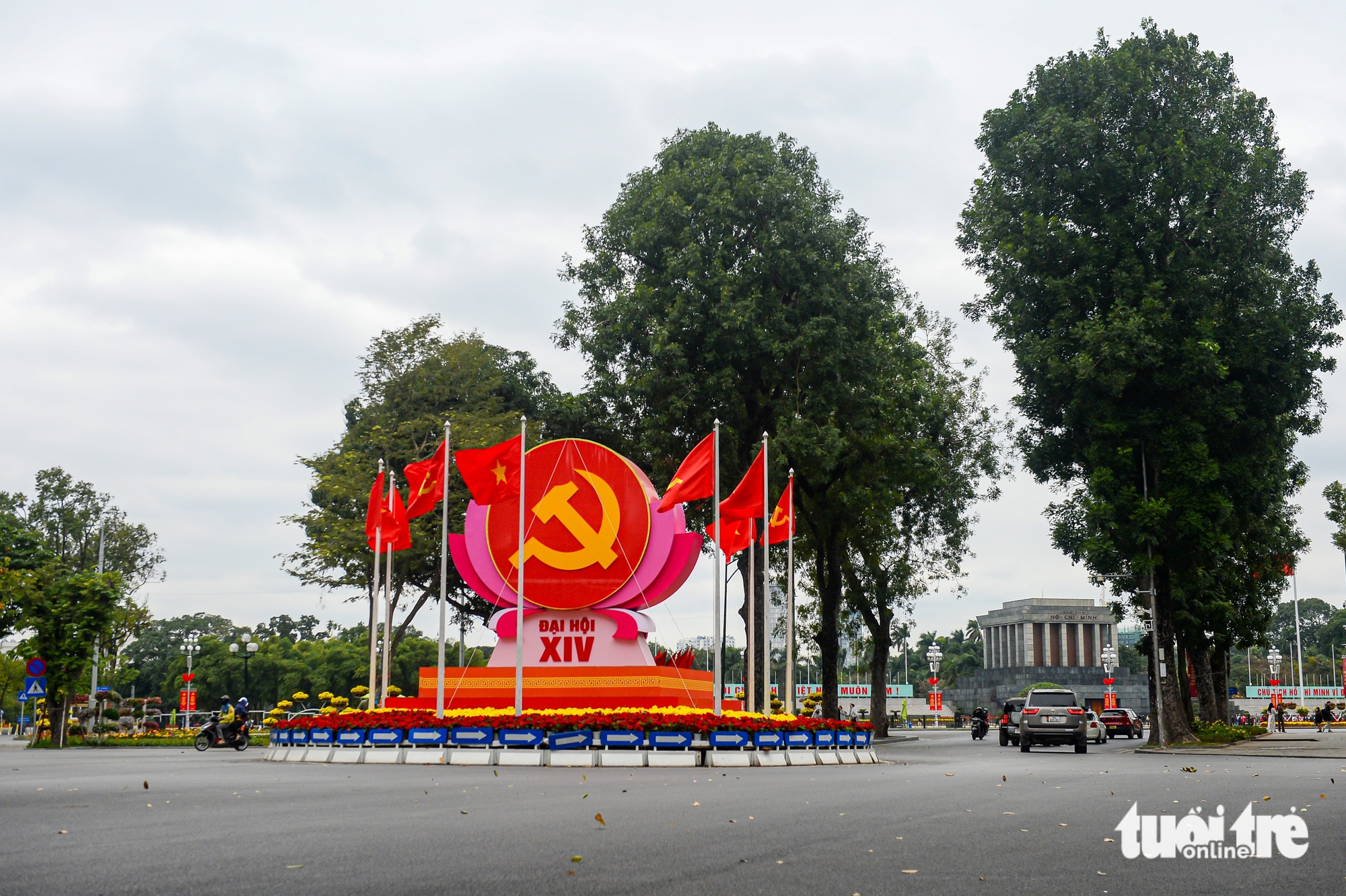 Không gian quanh nút giao Thanh Niên - Quán Thánh - Thụy Khuê được trang hoàng cờ hoa, pano chào mừng Đại hội lần thứ XIV của Đảng, tạo nên không khí vui mừng, phấn khởi - Ảnh: PHÚC TÀI