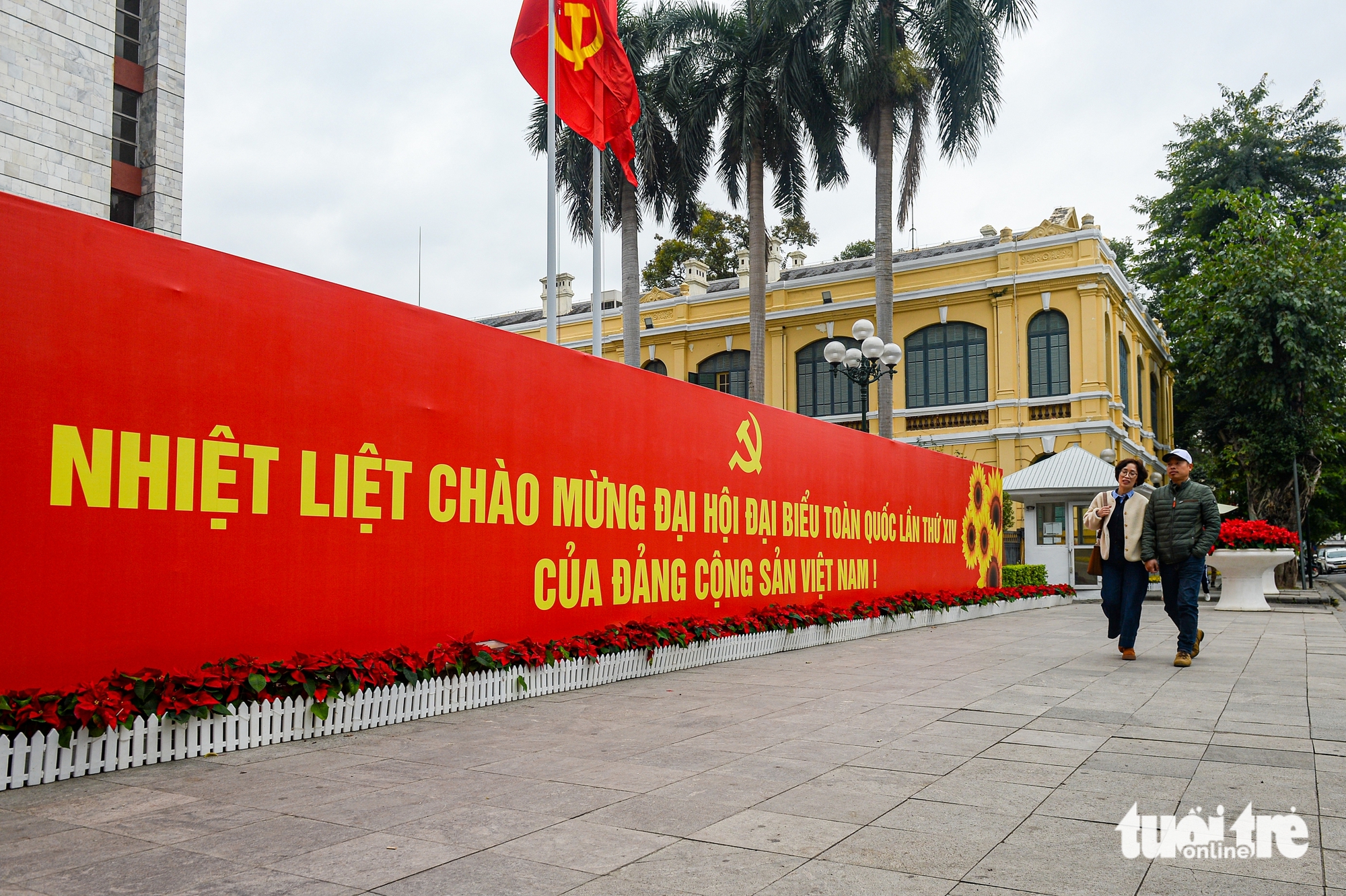 Theo ghi nhận của Tuổi Trẻ Online, tại khu vực hồ Gươm, các tuyến phố lân cận và nhiều trục đường chính, cờ Tổ quốc, cờ Đảng cùng băng rôn, khẩu hiệu chào mừng Đại hội lần thứ XIV của Đảng được treo, bố trí đồng loạt, ngay ngắn.