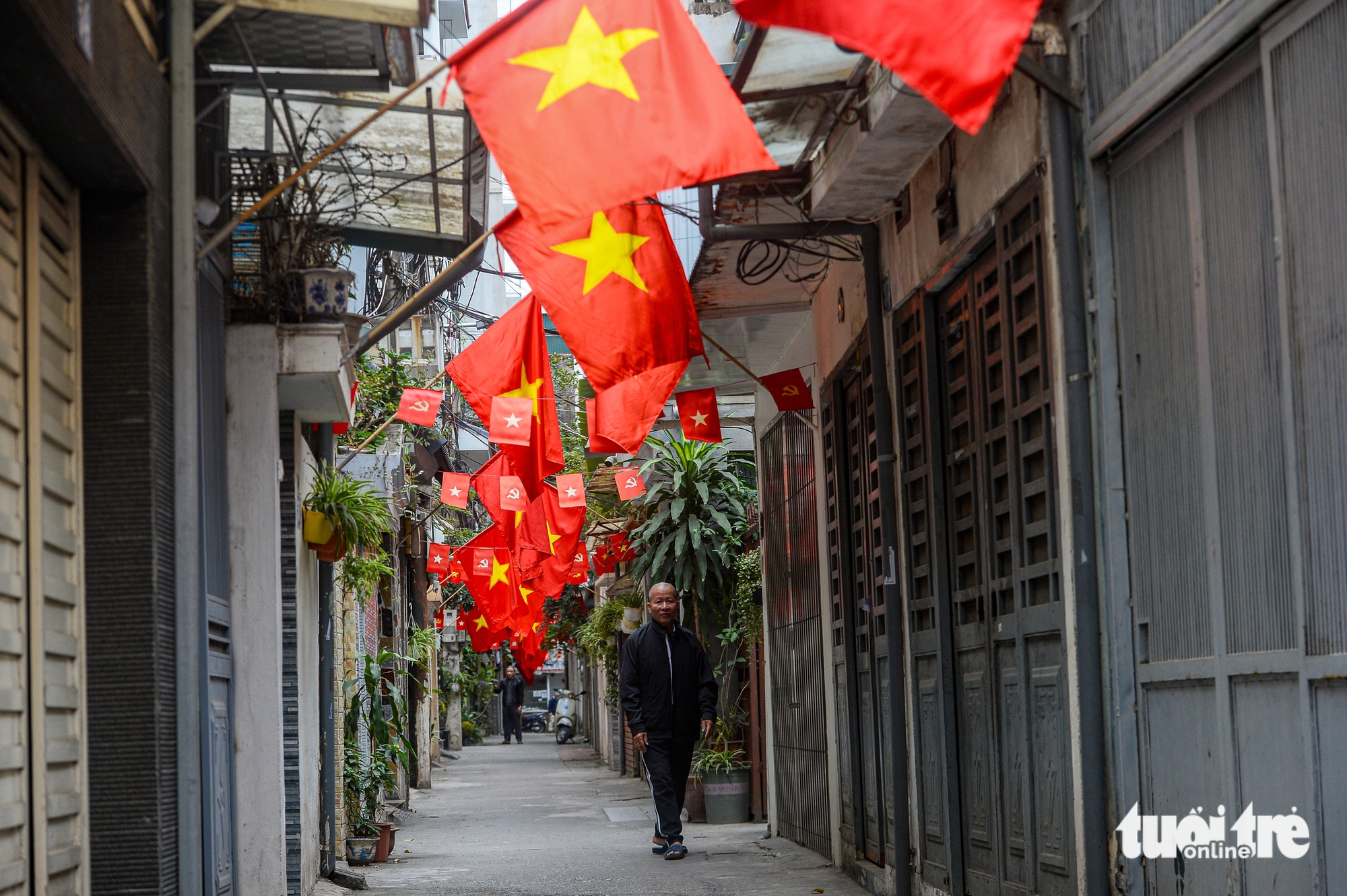 Trong ngõ nhỏ ở phường Giảng Võ, cờ Tổ quốc và cờ Đảng được treo dọc lối đi - Ảnh: PHÚC TÀI